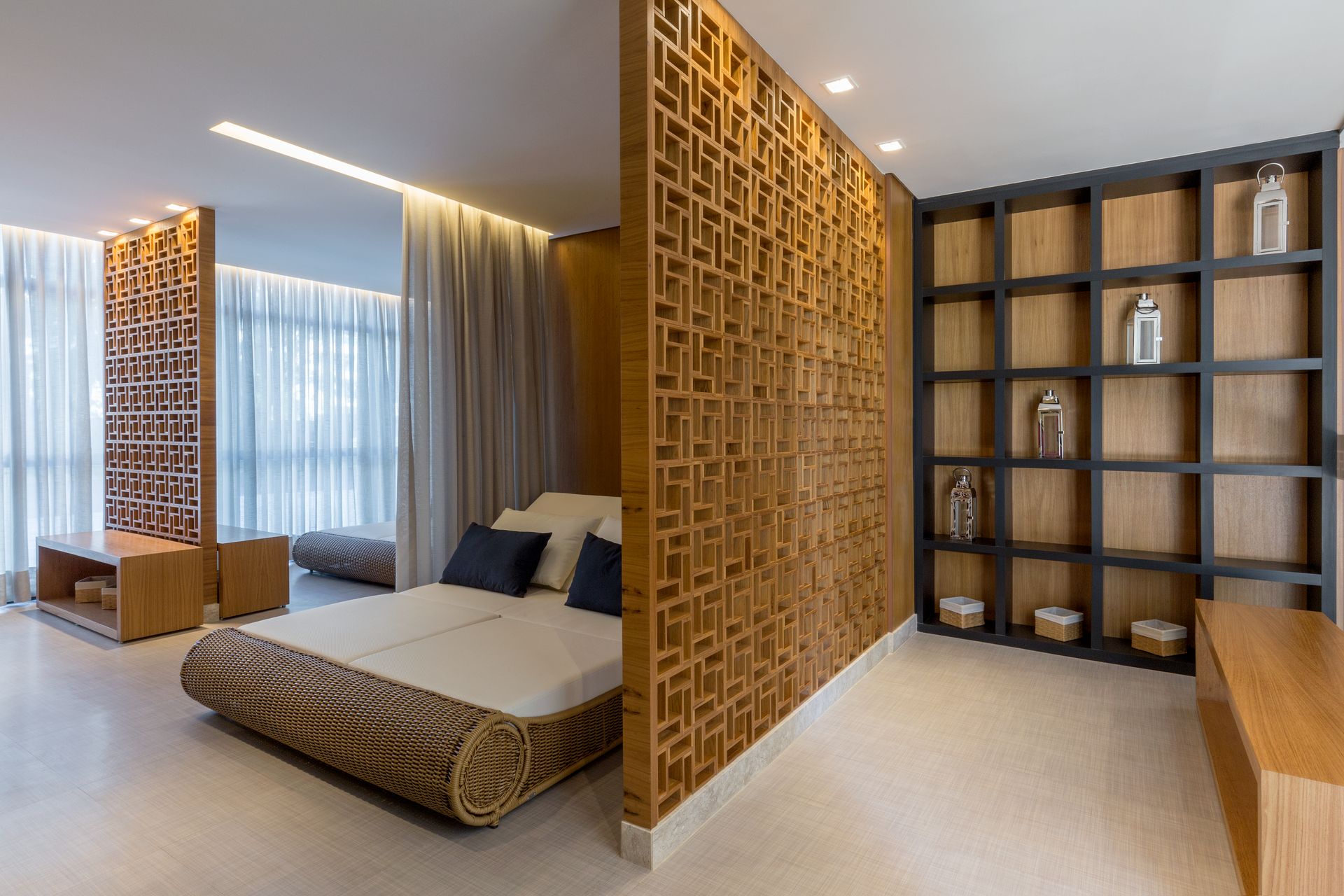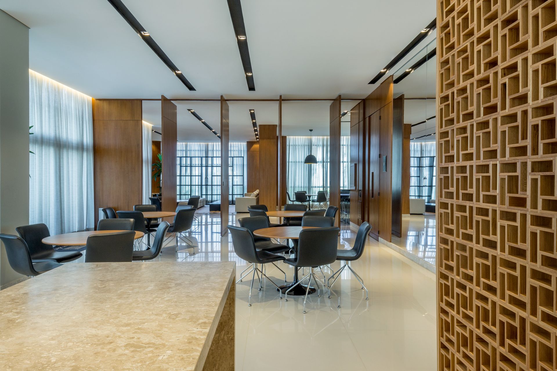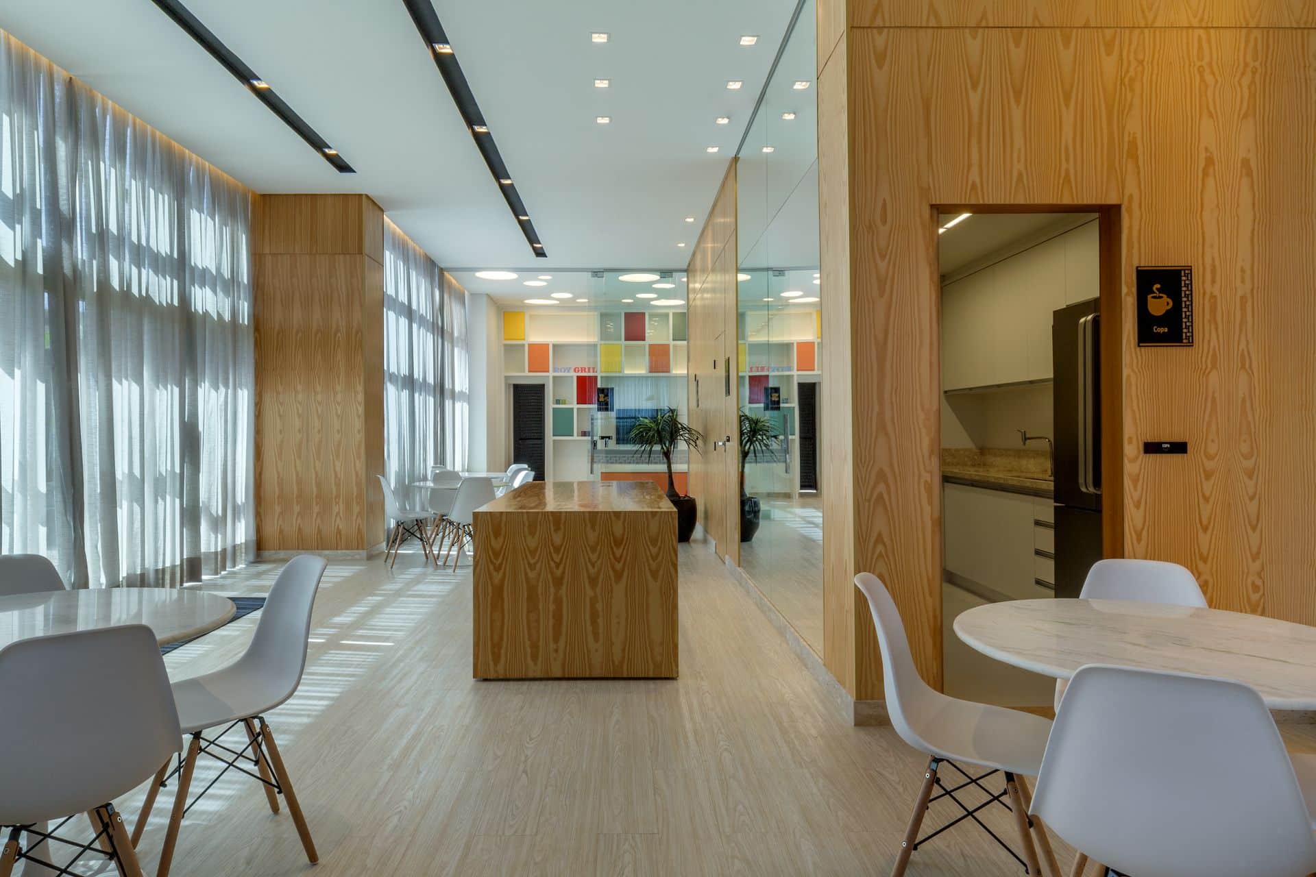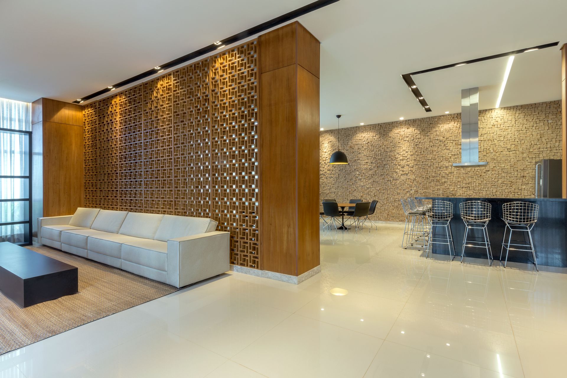 Os apartamentos são verdadeiras obras de arte, com acabamento interno de altíssimo padrão. O living é espetacular, com belos espaços que recebem acabamento em mármore bronze armani e painéis ripados em lâmina natural de madeira. As cozinhas são equipadas com eletrodomésticos de alta qualidade da Elettromec, bancadas em granito São Gabriel polido e marcenaria planejada em MDF fosco. Os lavabos e banheiros seguem o mesmo padrão, com revestimentos em pedra ferro natural e granito, além de louças e metais de marcas renomadas como Deca.