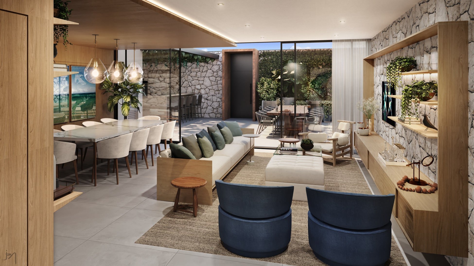 As Townhouses, por sua vez, oferecem uma experiência única com casas que variam de 301m² a 432,88m², todas com quatro suítes e um quintal privativo, garantindo a segurança e o conforto de um prédio.